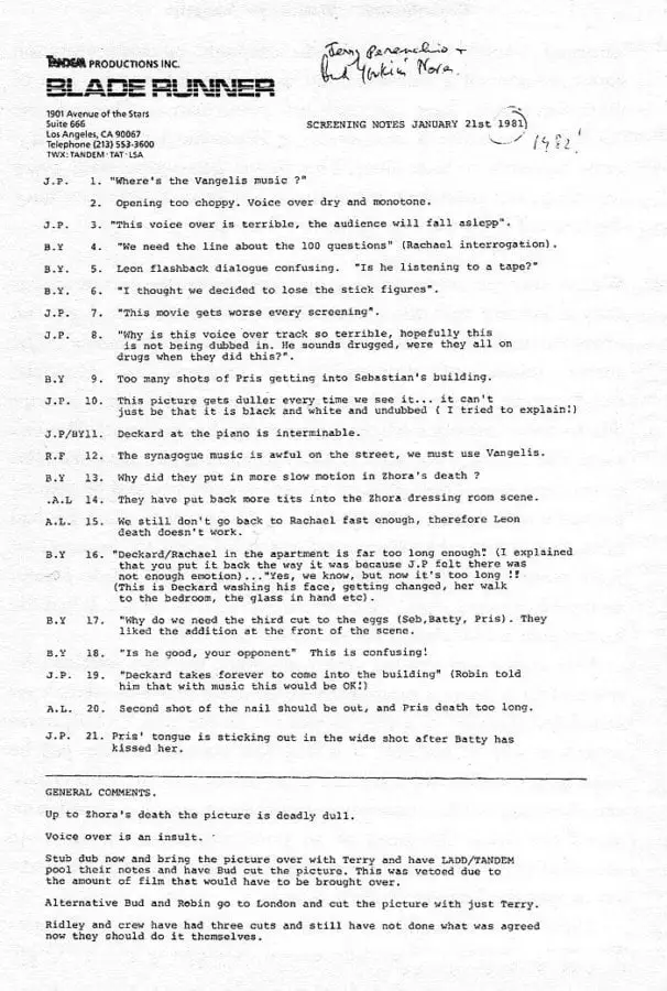 Outros seios!: Leia as notas escandalosas do estudo para a obra -prima de Ridley Scott Blade Runner